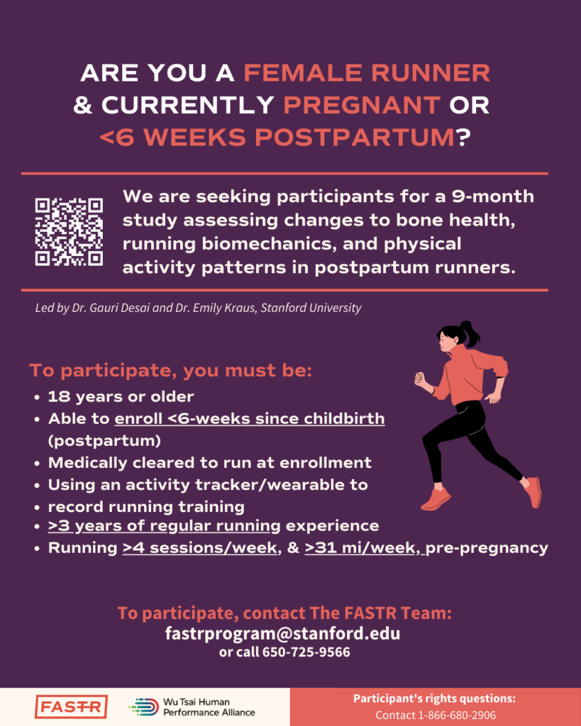 A Stanford University team is seeking participants for a 9-month study assessing changes to bone health, running biomechanics, and physical activity patterns in postpartum runners.